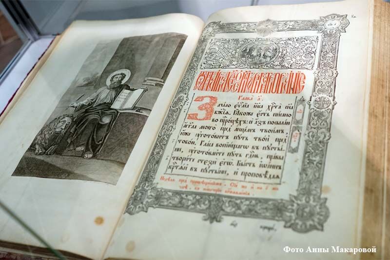 Часть экспозиции посвящена богослужебным книгам ХVIII — ХIХ веков. Книги — огромные, почти метровые. Вот рукописная старообрядческая Псалтырь первой половины ХIХ века. Поразительно, но выписывалась вручную каждая буковка столь аккуратно и прилежно, что не отличишь от печатной. Это был огромный труд, который, по словам митрополита Иосифа, «не стали бы тратить на всякую ерунду, переписывали главные сокровенные книги — Библию, Евангелие, жития святых…».