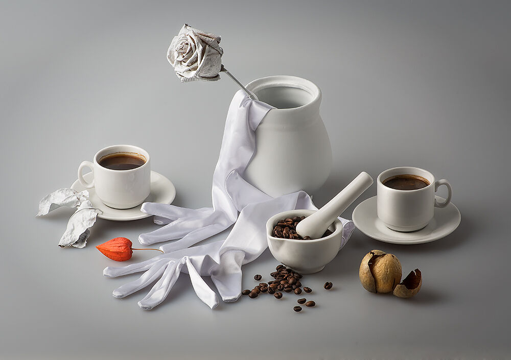 Два натюрморта «Белая гвардия» — предметы и фон белы: бутылки, алхимически-гастрономическая ступка с пестиком, вазы; сухие цветы и живые цветовые пятна — то оранжевая чашечка «китайского фонарика», то лиловый полевой цветок. Формы посуды отсылают нас к Баухаусу — зародившемуся в 1919 году в Германии художественному течению, поставившему на функциональность, компактность, отказ от орнаментики, правившей в искусстве и быте с XV века до первой мировой войны. Не только катастрофа последней вызвала к жизни стиль Баухаус, принципы которого («что удобно, то и красиво», «форма следует за функцией») уже почти 100 лет правят промышленным и прикладным дизайном. Движение к ясности форм зрело на протестантском севере Европы веками, а теперь мы читаем его везде: в мебели IKEA, в прибалтийской школе фотографии, в неуклюжей, но комфортной датской обуви Ecco, в шрифтах на экранах смартфонов. Лучшие образцы стиля — кажущегося иногда неловким, намеренно угловатым — это уверенная, иногда дерзкая красота, убежденность в собственном соответствии миру, в своей со-временности.