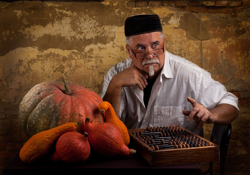 А вот «Автопортрет с тыквами»: автор сидит у стола с теми же тыквами как реквизитом, но вокруг него светло, и сам он в академической шапочке, какую в дореволюционной России и СССР носили академики (например, философ Алексей Лосев), окончившие университет при царях. На лице Сергеева — свет уже другой жизни.
