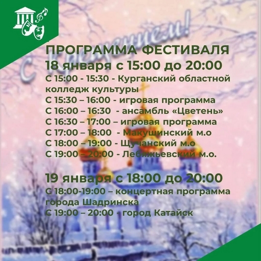 Большой Крещенский фестиваль (0+) состоится в Кургане 18 и 19 января на центральной площади города. Как сообщили организаторы, программа начнётся в 15:00.