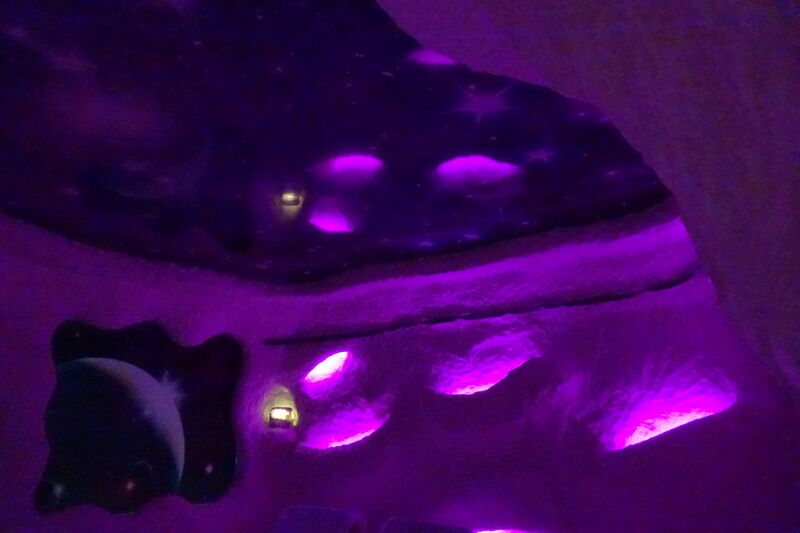 Приглушенный свет перетекает из одного оттенка в другой, добавляя пещере успокаивающей камерности. Для взрослых здесь стоят удобные кресла, которые легко приводятся в вертикальное положение и превращаются в «лежанки». Расслабляющая медитативная музыка помогает полностью отпустить напряжение и даже заснуть, а это очень полезно — во сне эффект достигается гораздо быстрее и глубже. Чем расслабленнее человек, тем лучше он усваивает из воздуха полезные вещества благодаря спокойному глубокому дыханию. Сеанс длится 40 минут, так что многие успевают по-настоящему отдохнуть.