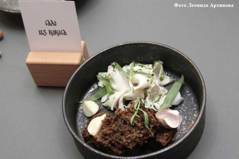Одни описания представленных блюд уже завораживали и будили бешеный аппетит: «лангустин с вишней и ананасовым консоме», «паштет из индюшачьей печени, в какао панцире на мармеладе из смородины», «суфле из морского окуня с лососем, муссом из томленной тыквы, крокетом из картофеля и овощным штруделем с соусом на основе сливок и трав»! Жаль, дегустация не входила в программу конкурса. Но один секрет вкуса я всё же раскрыла, отведав предложенное мне поваром Кириллом Костериным из Челябинска сало… из кокоса! На вкус никак не отличишь от самого изысканного свиного сальца.