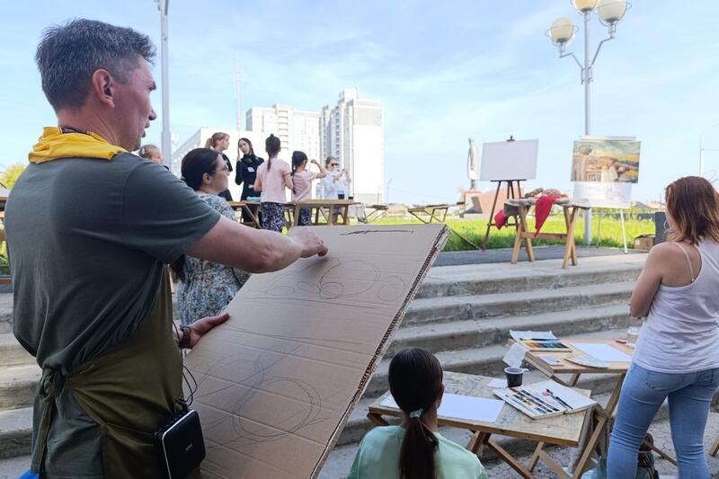 В рамках «Аквафеста» у стен Детской музыкальной школы № 1 в Кургане 24 августа состоялся мастер-класс художника Юрия Ошева. Участники пленэра, в том числе корреспондент газеты «Курган и курганцы», рисовали хлебный натюрморт на фоне Богоявленского собора.