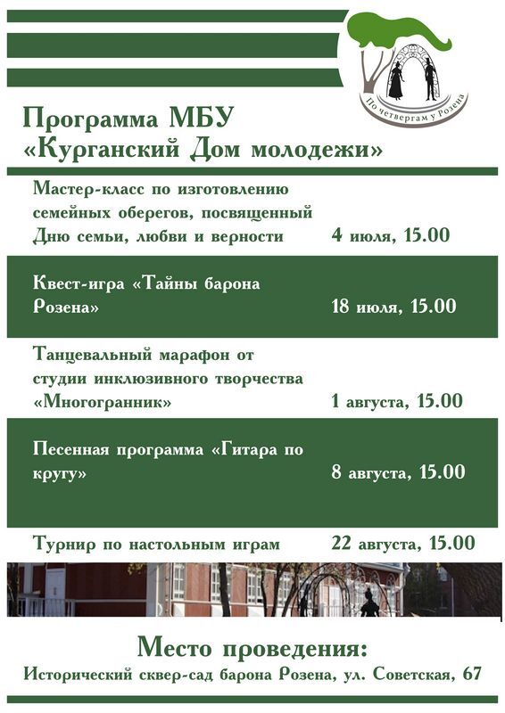 4 июля представители Курганского Дома молодежи проведут в историческом сквере-саду барона Розена мастер-класс по изготовлению семейных оберегов, посвященный приближающемуся Дню семьи, любви и верности. В этот же день Курганская областная универсальная научная библиотека имени А.К. Югова представит книжную выставку «Экологический калейдоскоп». Сотрудники Юговки проведут для горожан две викторины – «Тайны и загадки природы» и «Экологический эрудит».