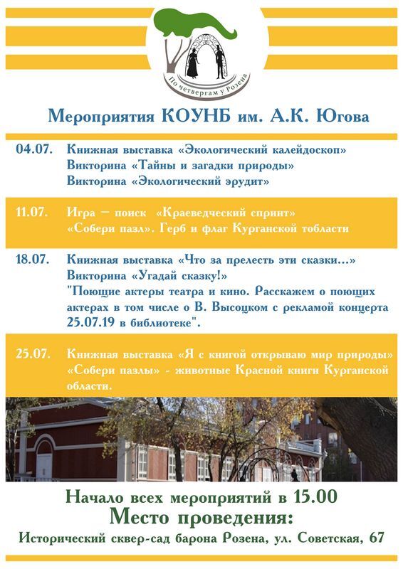 18 июля сотрудники Курганского дома молодежи проведут с горожанами квест-игру «Тайны барона Розена». Библиотекари Юговки предложат вниманию курганцев книжную выставку «Что за прелесть эти сказки…», проведут викторину «Угадай сказку!», и расскажут о поющих актерах театра и кино, в том числе и о народном любимце Владимире Высоцком.