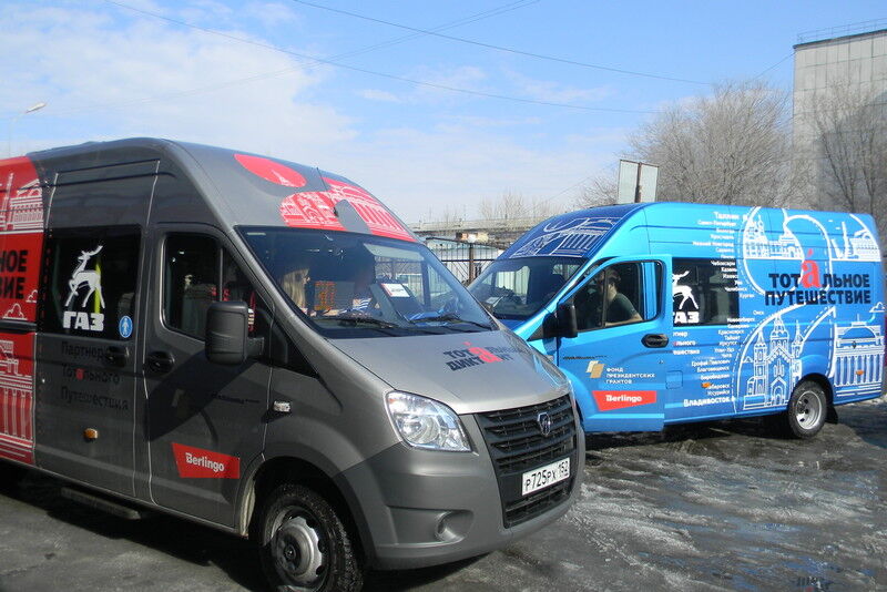 В рамках проекта по маршруту Владивосток-Таллин на отечественных «Газелях» от Тихого океана к Атлантическому с визитами в 27 городов заезжают филологи, писатели, блогеры. Им предстоит преодолеть 10 000 км до старта Тотального диктанта, который пройдет 13 апреля. В городах маршрута участники путешествия проводят увлекательные лекции об языке и общаются с жителями на улицах.