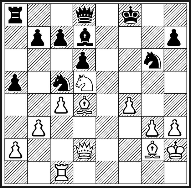 Но основная нагрузка в команде легла на плечи лидера – Дениса Лисьих. Ему приходилось сдерживать изощренные атаки рейтинговых кандидатов в мастера, двух Владимиров – Уфимцева (Куртамыш) и Фителя (Кетово), происки других менее титулованных, но очень упорных соперников. Посмотрите, как в важнейшем для распределения мест 6-м туре Денис реализовал преимущество в матче с честолюбивыми каргапольцами (см. диаг.).