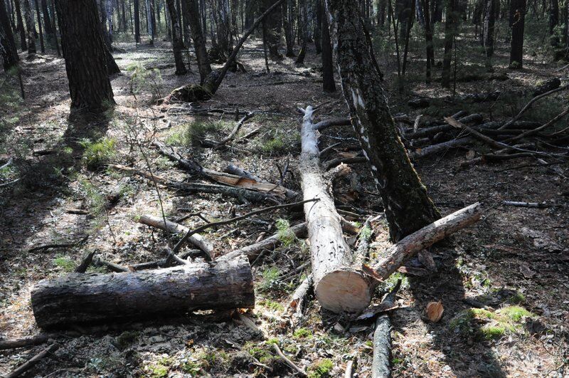 В общей сложности в том районе, где работали нарушители, спилено около двадцати сосен. По словам Анатолия Тарасенко, деревья здесь рубили в последние два дня. Все происходило ночью.