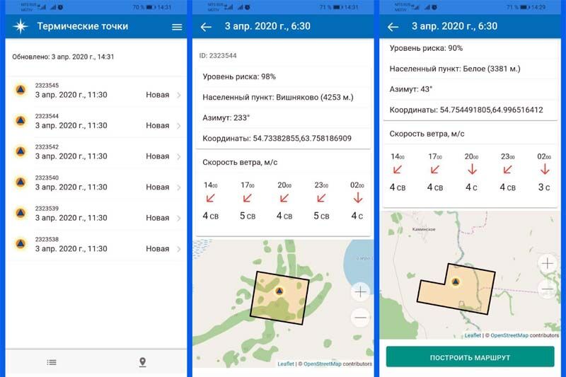 Термические точки в приложении представлены перечнем. У каждой есть номер, дата и время возникновения, площадь контура, уровень риска, статус. Если нажать на номер точки, появится ее карточка с географической информацией, прогнозом направления и скорости ветра в этом месте на ближайшие 12 часов, карта с возможностью построения маршрута до точки. Можно также посмотреть все термические точки в пределах заданного контура на карте.