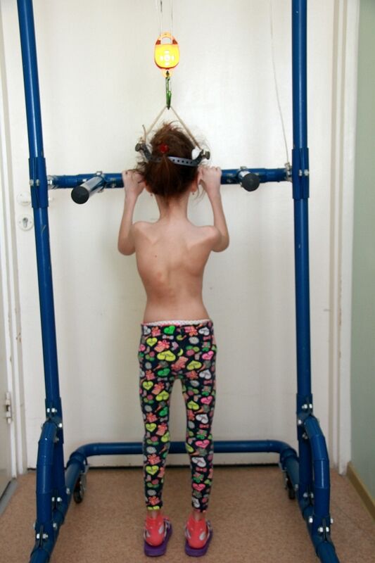 Первым этапом лечения Айсылу и было вытяжение. На её черепе укрепили «корону», за которую «подвесили» к специальной конструкции, что-то вроде турника на колёсиках. С ней Айсылу передвигалась днём. А ночью вытяжением «занимались» грузы: начинали с 1 кг, дошли до 4 кг.