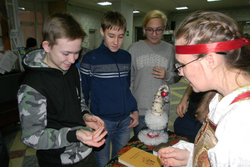 Как известно, сочельник – последний день святочных гаданий, а в библиотеке гадания, конечно, литературные. У камина и нарядной елочки в фойе библиотеки толпился народ – каждый хотел узнать судьбу благодаря случайно открытым страницам в томиках книг. И в прежние времена читатели предпочитали гадать по знаменитому пушкинскому роману в стихах «Евгений Онегин», и сейчас ничего не изменилось – по-прежнему загадывают страницы, где поэтические строки – подсказки на будущее. В старину на чем только не гадали: на ключах, на воске, на зеркалах, на рукавичке и валенках, на следе, на услышанном обрывке разговора и даже на собачьем лае!