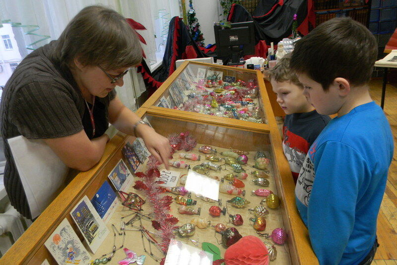 Но самый большой интерес и взрослых, и детей вызвала выставка новогодних игрушек и открыток 40–70-х годов. Старейшая из открыток относится к началу Первой мировой войны, к 1914 году. По новогодним игрушкам легко проследить историю страны: сначала бедные, простенькие — из картона, покрашенные серебрянкой, в виде стекляруса и бус – первые послевоенные игрушки. Елочные украшения на прищепке – это мода 50-х годов, а в 60-е самый писк – игрушки в виде спутника и ракет. Бонусом к отечественным новогодним праздникам в библиотеке шло посещение выставки китайских традиций, на ней дети всех возрастов с восторгом фотографировались с древним оружием китайских воинов и любовались новогодними украшениями далекой страны. Возможно, загаданное в сочельник чье-то желание о путешествиях таким образом стало ближе к исполнению.